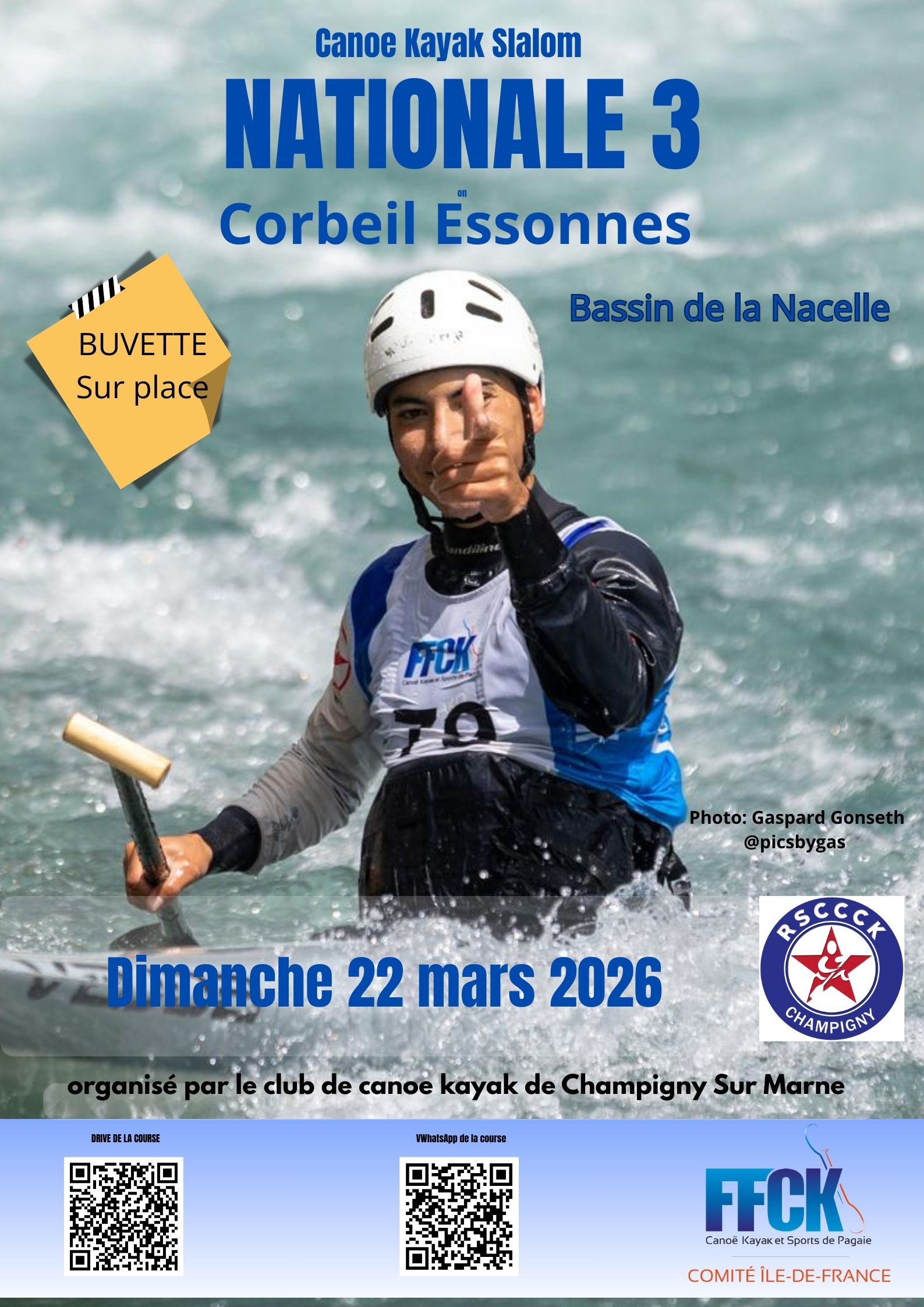 Le CDCK94 et le Red Star Club Champigny ont le plaisir de vous inviter sur le bassin de la Nacelle pour les première et deuxième manches de la Coupe de France de slalom Nationale 3 les 21 et 22 mars 2026.